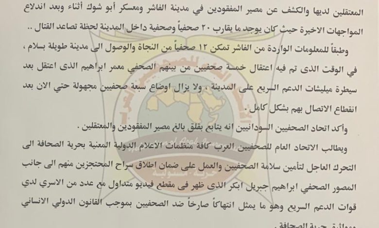 الاتحاد العام للصحفيين العرب يطالب قوات الدعم السريع بالافراج عن الصحفيين السودانيين المعتقلين لديها فوراً