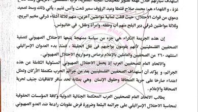 الاتحاد العام للصحفيين العرب يدين استشهاد