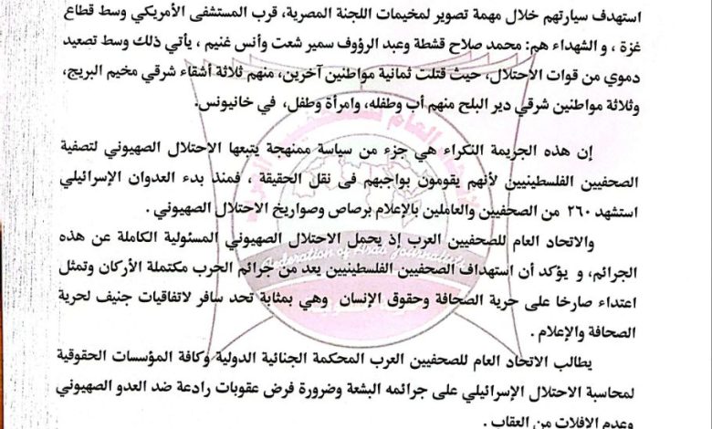 الاتحاد العام للصحفيين العرب يدين بكل قوة جريمة إغتيال الاحتلال الصهيوني للصحفيين الفسطينيين فى غزة
