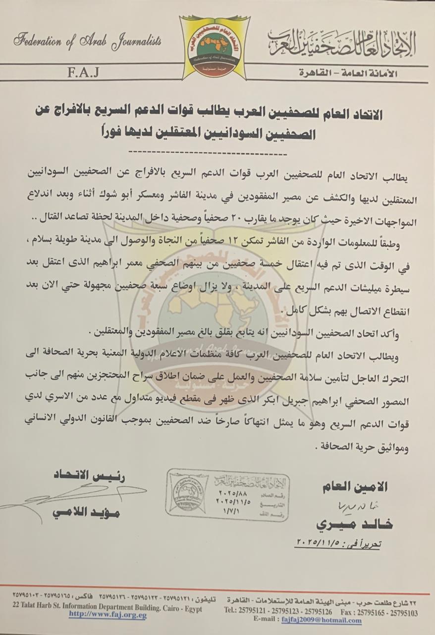 يطالب الاتحاد العام للصحفيين العرب قوات الدعم السريع بالافراج عن الصحفيين السودانيين المعتقلين لديها والكشف عن مصير المفقودين في مدينة الفاشر ومعسكر أبو شوك أثناء وبعد اندلاع المواجهات الاخيرة حيث كان يوجد ما يقارب 20 صحفياً وصحفية داخل المدينة لحظة تصاعد القتال ..