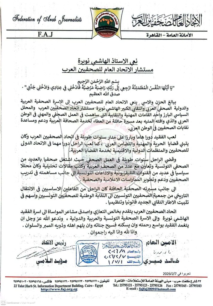 ببالغ الحزن والاسي ينعي الاتحاد العام للصحفيين العرب الى الاسرة الصحفية العربية والدولية الصحفي العربي والنقابي الكبير الهاشمي نويرة مستشار اتحاد الصحفيين العرب والمحلل السياسي البارز واحد القامات المهنية والنقابية التى ساهمت فى العمل الصحفي والمهني فى الوطن العربي والذي وافته المنيه بعد مسيرة حافلة من العطاء لخدمة الصحافة العربية ودعم ومساعدة نقابات الصحفيين فى الوطن العربي.